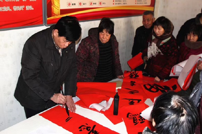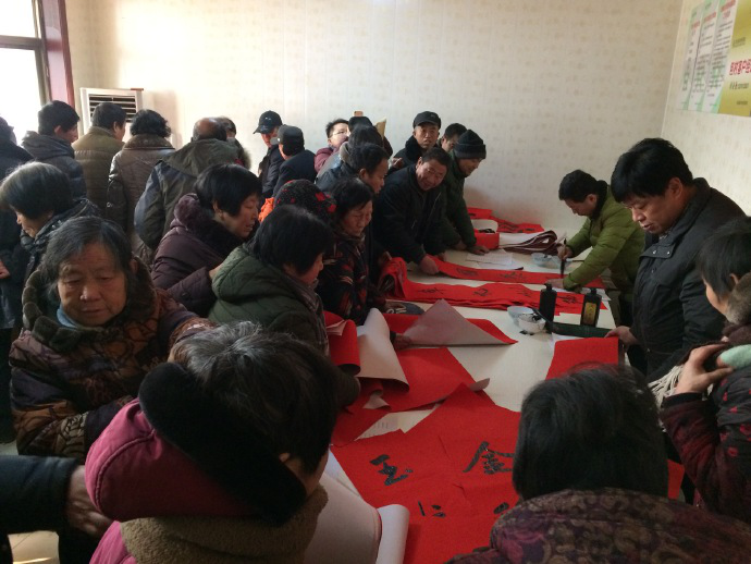 å¯åŠ¨ä»ªå¼ç»“æŸåŽï¼Œä¹¦æ˜¥æ´»åЍæ£å¼å¼€å§‹ï¼Œæ‘å…šæ”¯éƒ¨ä¼šè®®å®¤æ—©å·²æ‘†èµ·å¤šå¼ é•¿æ¡Œï¼Œä¹¦æ³•å®¶ä»¬å‡†å¤‡å¥½äº†æ–°è¿‘åˆ›ä½œçš„æ•°ç™¾å‰¯æ˜¥è”用è¯é›†é”¦ä¾›å¤§å®¶æŒ‘选,也有群众带ç€è‡ªå·±é¢„先想好的春è”è¯è¯·ä¹¦æ³•家们留下墨å®ã€‚“大政旗红春万象,å°åº·ä¸šæ—ºç¦åƒæ‘。â€â€œç‡•赵雄风多给力,ä¸åŽå¥½æ¢¦æ£è…¾é¾™ã€‚â€â€œçЬéšé¸¡è‡³ç”Ÿæ´»ç¾Žï¼Œç¦ä¼´æ˜¥æ¥æ—¶ä»£æ–°ã€‚â€â€¦â€¦æ•´æ•´ä¸€å¤©æ—¶é—´ï¼Œä¸€åƒå¤šå‰¯æ˜¥è”和大红“ç¦â€å—被群众们争先æåŽåœ°æ‹¿åœ¨æ‰‹ä¸Šã€ç»†ç»†å“味ã€çˆ±ä¸é‡Šæ‰‹ã€‚